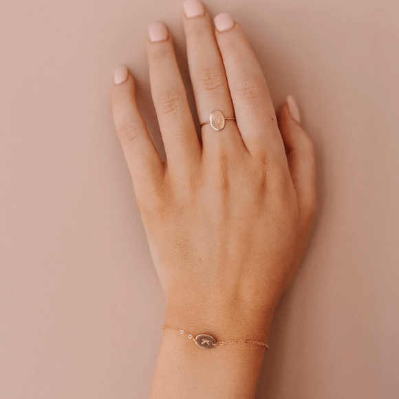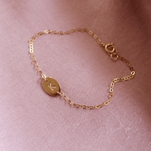 Personalized Lydia Oval Initial Bracelet—Available in Gold, Rose Gold, or Silver.